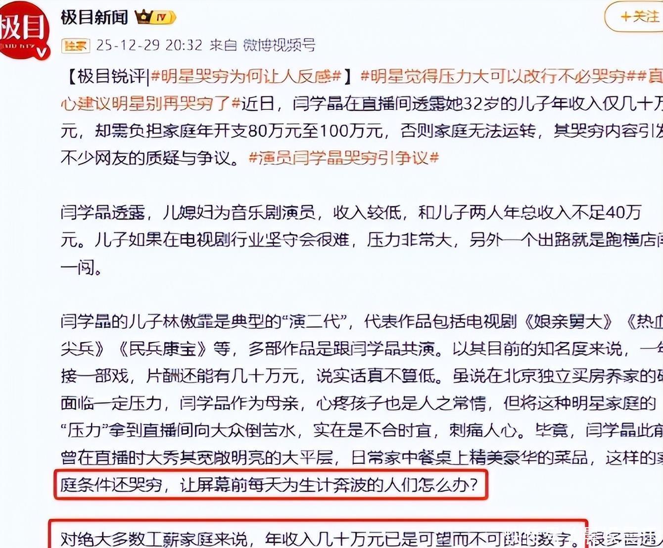 可是在2025年年底的时候,她在直播间里说自己的儿子一年就拍一部戏,一年挣就几十万,但是自己家的开销比较大,一年没个百八十万根本运转不了,压力实在是太大了,她这样的话一说出口,瞬间就在网络上爆炸了,因为我们普通人一辈子都挣不了这么多钱吧?但是她还哭穷,她这样的话给人的感觉就是她在凡尔赛,所以好多人也都在说,你挣的比我们多几十倍,还好意思哭穷,真的不要脸了吗?