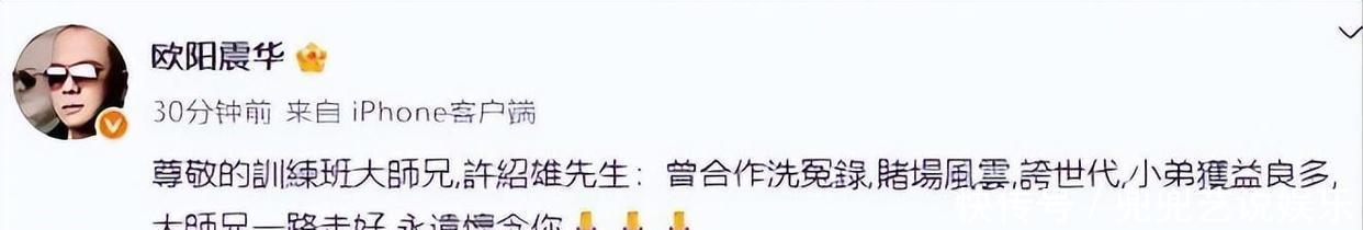 许绍雄离开之后,圈里不少有名气的演员也都陆续发出了悼念的声音。欧阳振华:尊敬的训练班前辈,许绍雄先生,我这小辈真是学到不少,大师兄一路顺风,永远怀念你啊。
